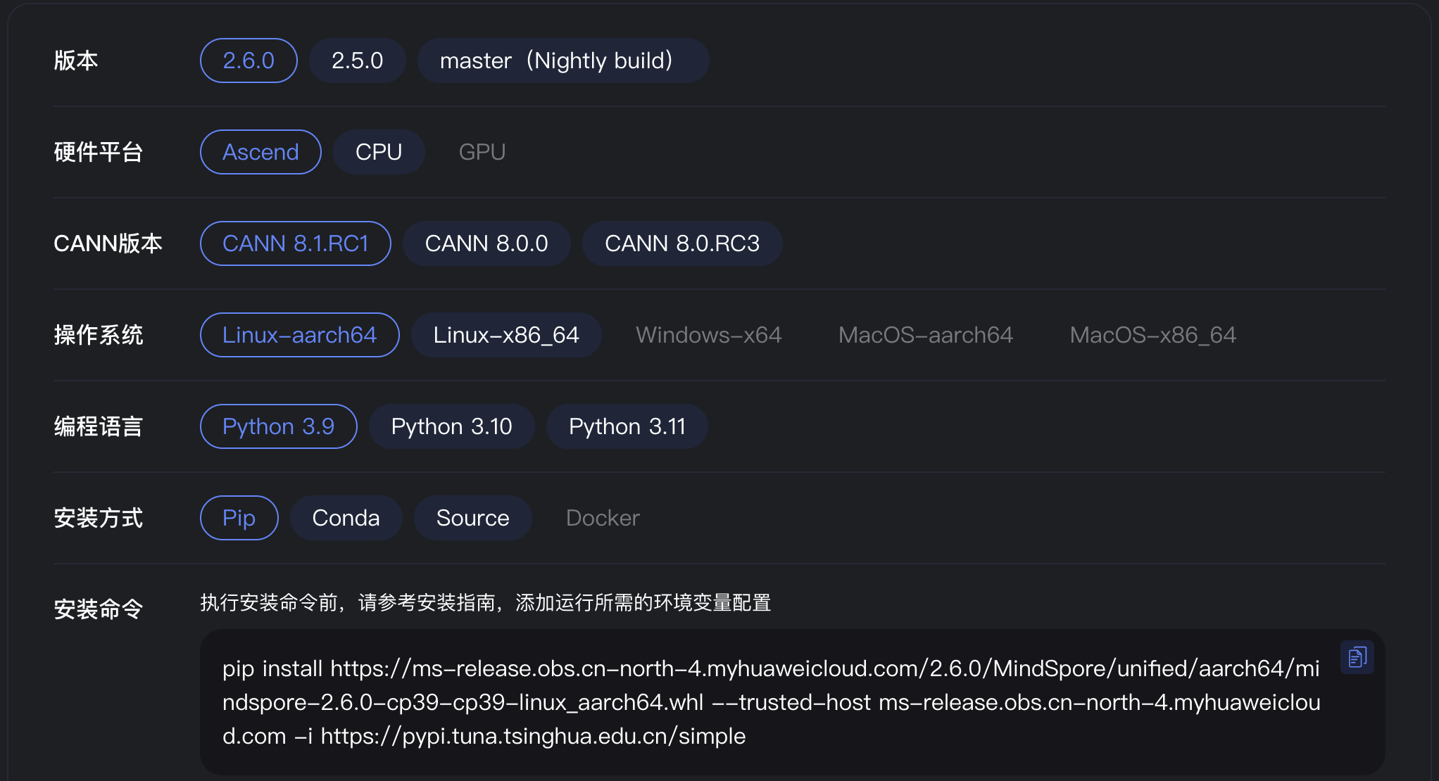 开发板的 Ubuntu 系统中已经预装了 MindSpore 2.2.12,实验中可以安装新版本的 mindspore,具体依照实验,注意 mindspore 版本和 cann toolkit 的兼容关系,可以在 历史版本 | 昇思MindSpore社区 中查看,mindspore 版本和 cann 的兼容关系。例如 CANN 7.0.0.beta1 最高支持到 cann2.2.14。