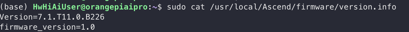 使用 sudo cat /usr/local/Ascend/firmware/version.info 来显示固件信息,例如下面显示固件版本为 7.1.0