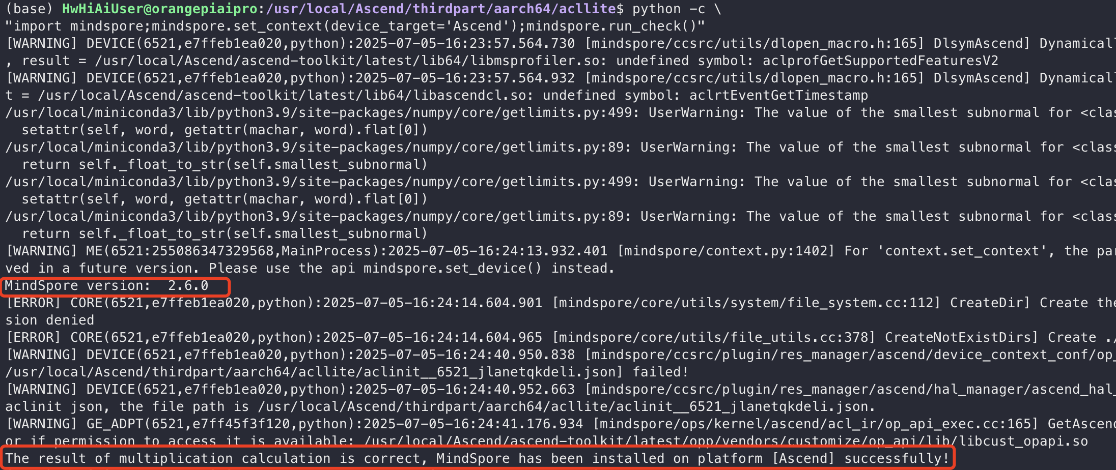 "import mindspore;mindspore.set_context(device_target='Ascend');mindspore.run_check()"