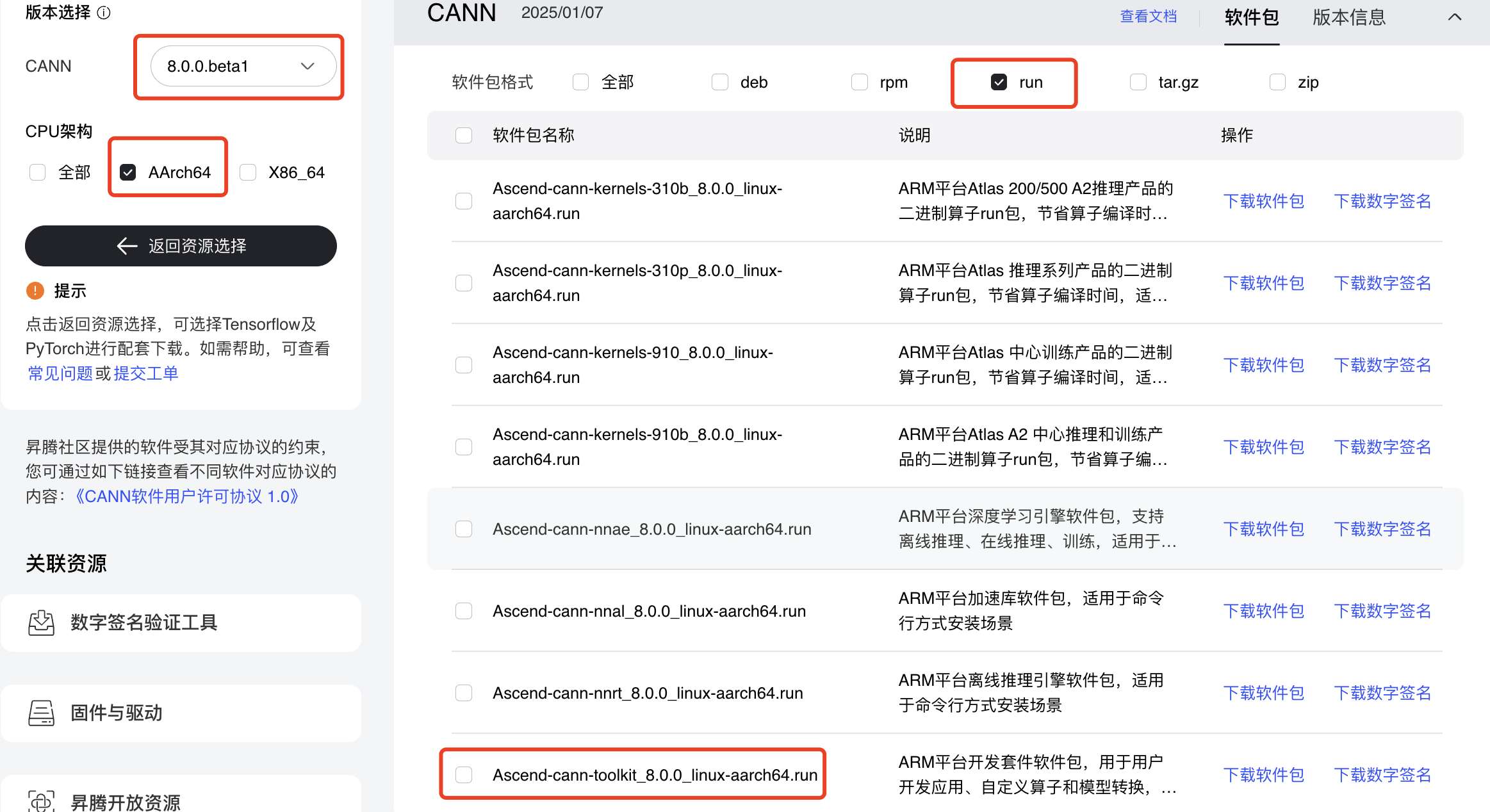 打开昇腾 CANN 官网访问社区版资源 下载地址,下载所需版本的 toolkit 包,例如这里选择 8.0.0 beta1 的 CANN 开发工具包。