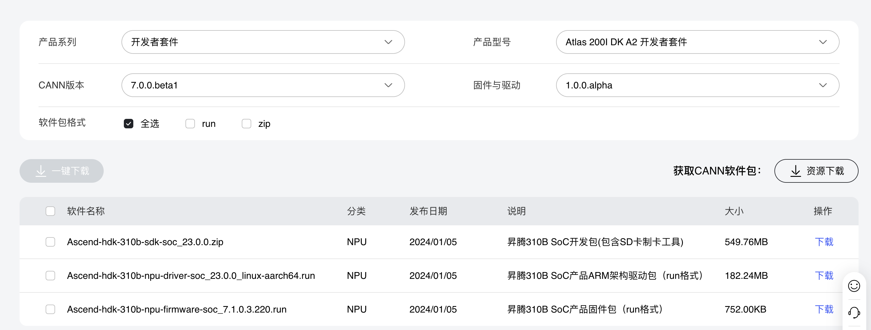 本实验可以将 CANN 升级到 8.0.0 beta1 或者更高(固件支持最高为 7.0.0,高版本 CANN 工具包可能引起兼容性问题) 社区版资源下载-资源下载中心-昇腾社区