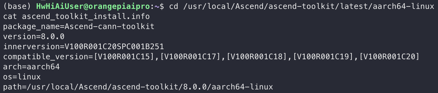 使用如下命令查看,当前 CANN 版本,例如我已经升级到 8.0.0 版本