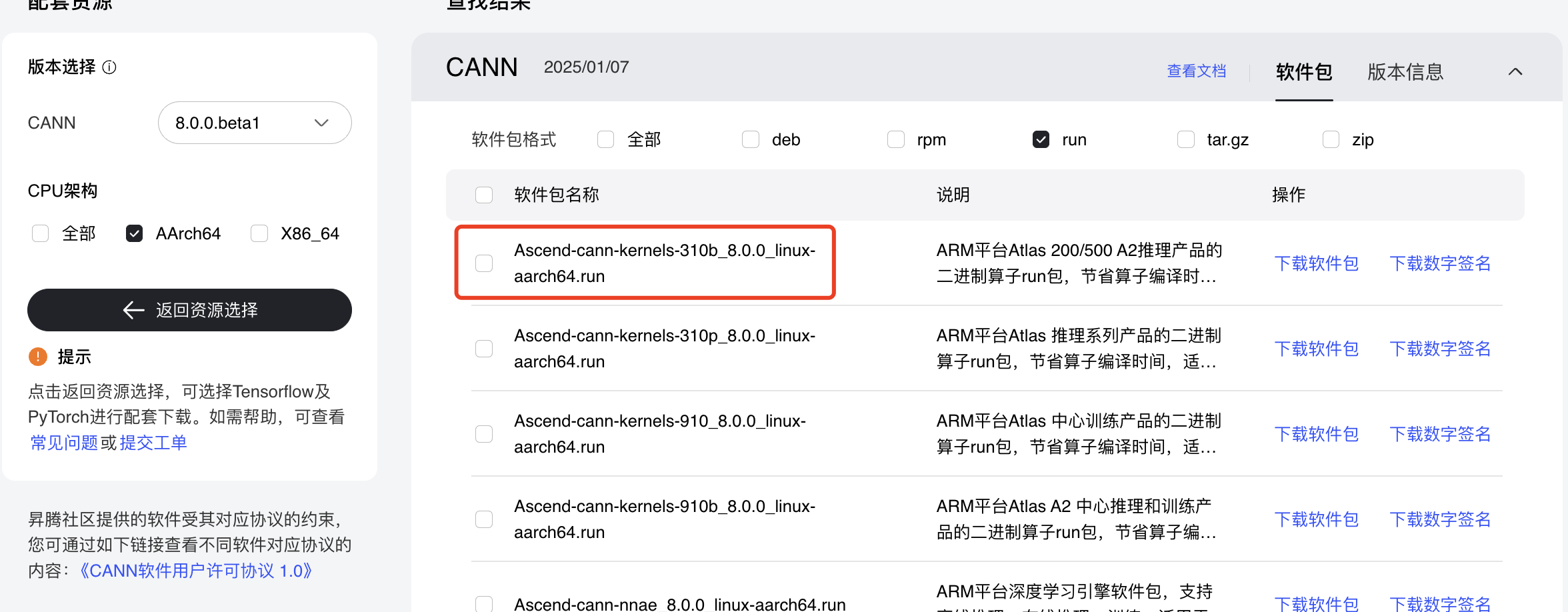 打开昇腾 CANN 官网访问社区版资源 下载地址,下载所需版本的 kernels 包,例如这里选择 8.0.0 beta1 的 CANN 开发工具包。